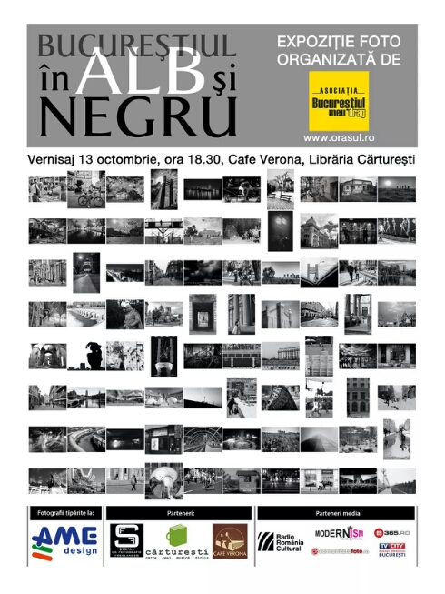 Asociatia „Bucurestiul meu drag” impreuna cu Libraria Carturesti si AME Design va invita la vernisajul expozitiei de fotografie „Bucurestiul in alb si negru” care va avea loc luni 13 octombrie 2014 la Cafe Verona, Libraria Carturesti (str. Arthur Verona nr. 13-15, sector 1), ora 18.30. Expunere 13-31 octombrie 2014