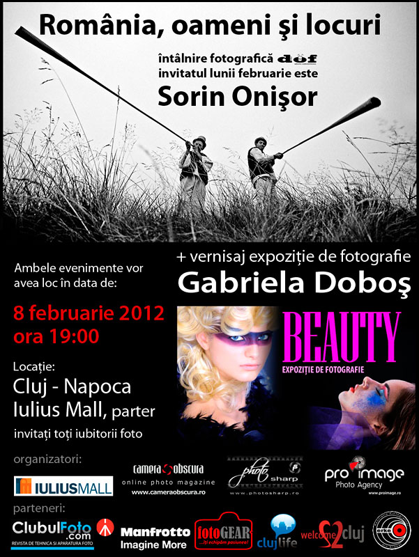 Colecţia „Beauty” va fi prezentată pasionaţilor de fotografie din Transilvania în debutul celei de-a 10-a proiecţii „Photo DOF”, al cărei oaspete va fi Sorin ONIŞOR. Invitat special de Camera Obscură şi Photo Sharp, renumitul fotograf le va vorbi artiştilor, în cuvinte şi imagini, despre „România, oameni şi locuri”.