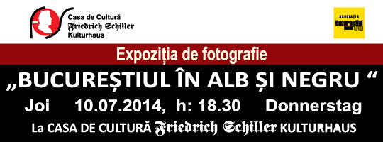 Asociația „ Bucureștiul meu drag”, împreună cu Casa de Cultură „Friedrich Schiller” vă invită joi 10 iulie 2014, ora 18,30 la vernisajul expoziției de fotografie „Bucureștiul în alb și negru” , care va avea loc la sediul Casei de Cultura „ Friedrich Schiller ” (Str. Batiștei, nr.15).