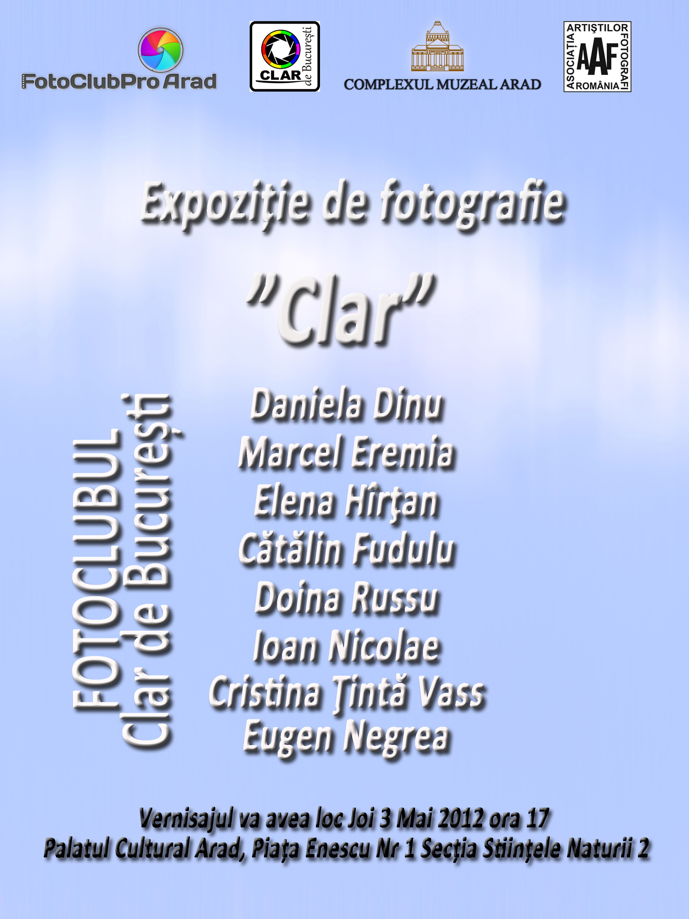 La invitația colegilor de la FotoClubPro Arad, fotoclubul Clar de București prezintă în orașul de pe malul Mureșului expoziția membrilor săi, intitulată „Clar”. Vernisajul va avea loc joi, 3 mai, ora 17, la Palatul Cultural. Vor fi prezentate 32 de fotografii de mari dimensiuni în care sunt abordate aproape toate genurile artei fotografice, de la portret la peisaj și de la eseu la fotojurnalism. Autorii lucrărilor sunt: Daniela Dinu, Marcel Eremia, Elena Hîrțan, Cătălin Fudulu, Doina Russu, Ioan Nicolae, Cristina Țintă-Vass și Eugen Negrea.