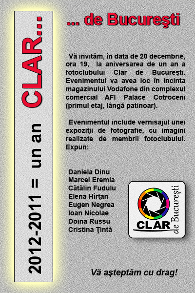 20 decembrie: Expoziția aniversară la un an de existență a fotoclubului ”Clar de București”
