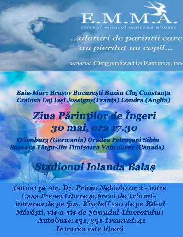 ”Vă invit duminică, 30 mai, de la 17.30, la un eveniment cu totul și cu totul special: „Ziua Părinților de Îngeri”, dealtfel, singurul din țară, dedicat memoriei copiilor plecați prea curând de lângă noi, când simultan în 18 orașe, se vor aprinde lumânări și se vor înălța la cer baloane colorate!