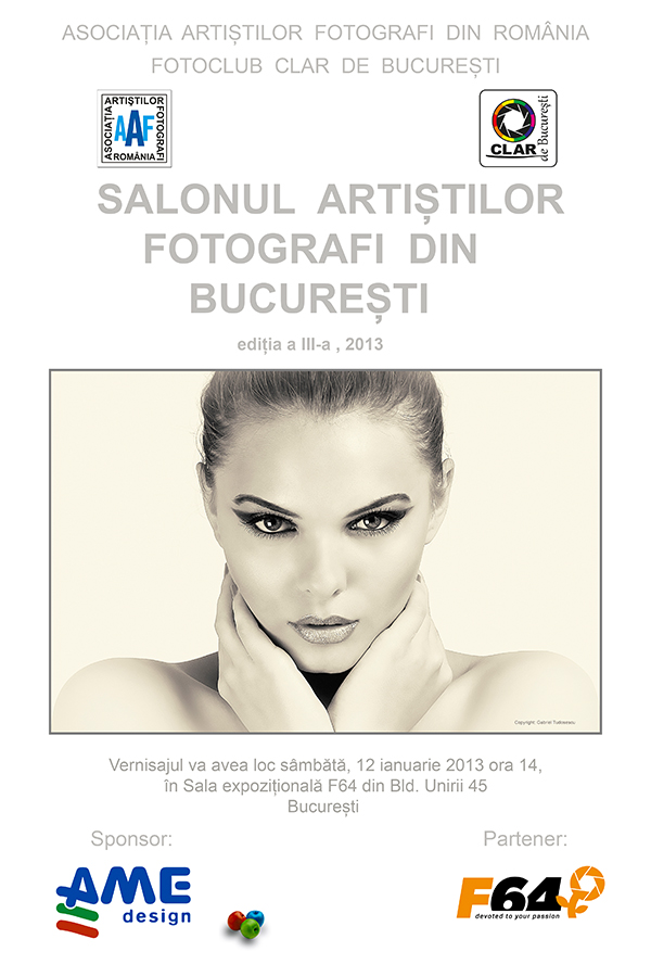 Organizat de Fotoclubul Clar de Bucureşti sub patronajul Asociaţiei Artiştilor Fotografi din România, cea de-a III-a ediţie a Salonului artiştilor fotografi din Bucureşti va fi vernisată sâmbătă, 12 ianuarie 2013, ora 14, în Spaţiul expoziţional F64, situat în blv. Unirii nr 45 din Bucureşti.