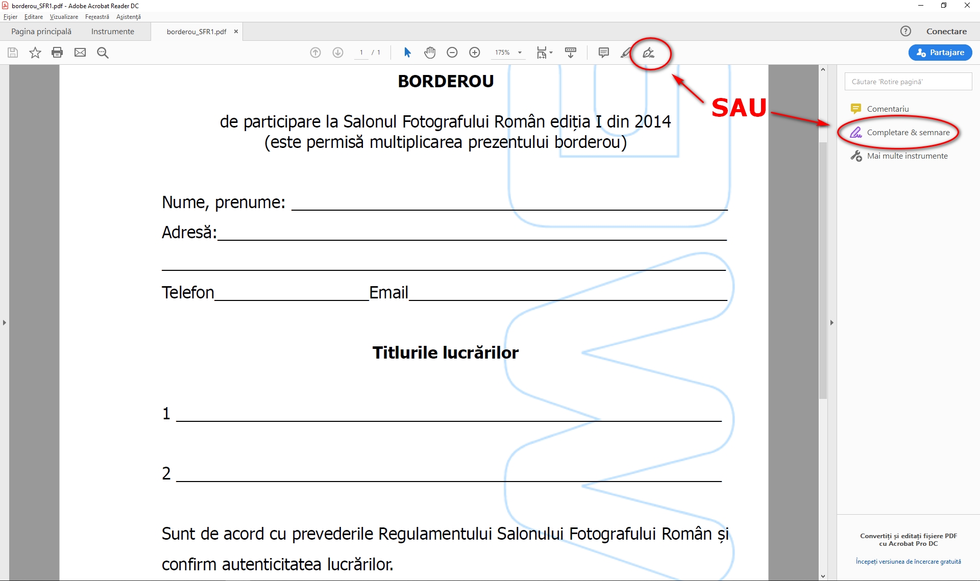 Deschidem documentul pdf cu acest program. Observăm că în partea din dreapta sus apare o iconiță sub formă de peniță sau în dreapta apare textul ”Completare & semnare” pentru cei care setează programul în limba română. Dați clic pe oricare dintre ele.