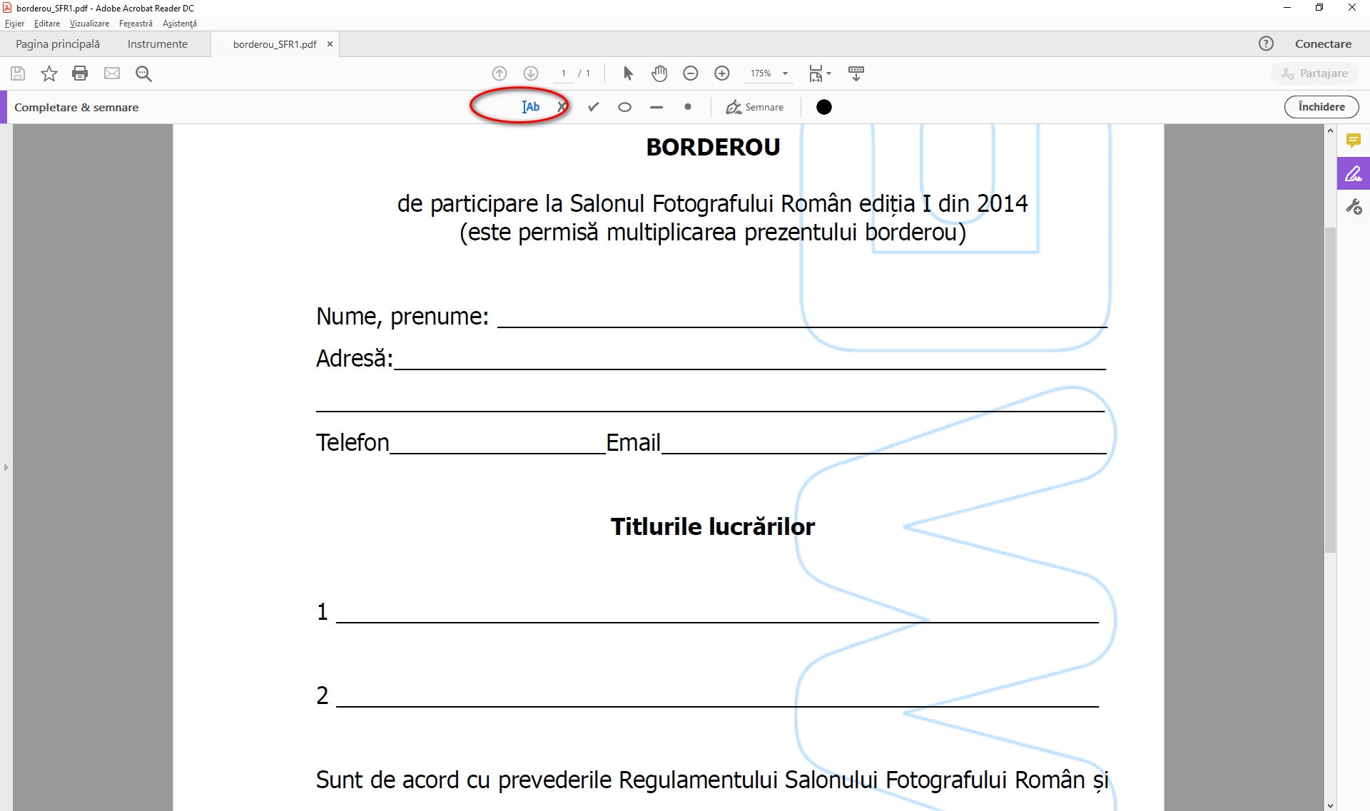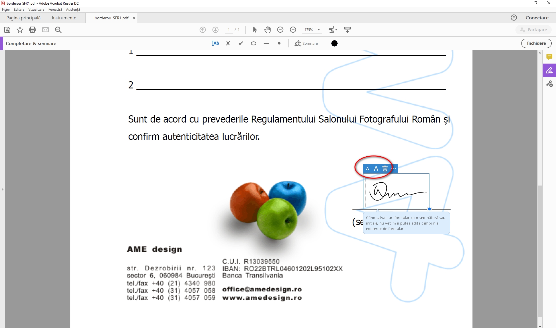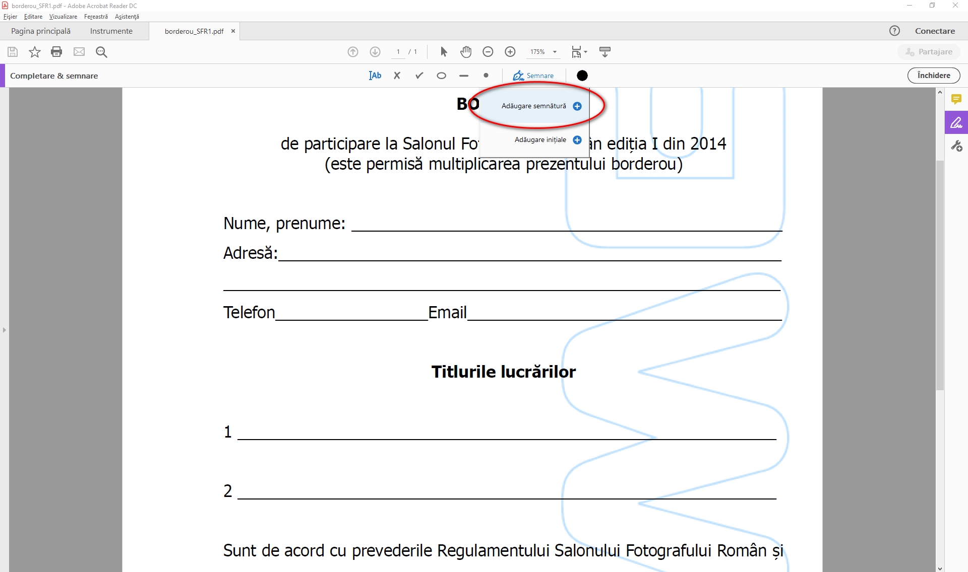 În urma întrebărilor primite din partea mai multor fotografi, am considerat că ar fi de mare ajutor dacă aș descrie un mic pont de completare a documentelor pdf. Există mai multe variante: deschiderea documentului pdf în Photoshop și rasterizarea lui la o rezoluție de cel puțin 150 ppi, format A4 și inserarea textului cu unealta de text. Semnătura va fi inserată ca imagine sau creată cu mouse-ul sau cu o tabletă grafică. O altă variantă este tipărirea documentului, completarea de mână și semnare, apoi scanarea/fotografierea și trimiterea ca jpg. Ambele variante implică trimiterea unui fișier de tip bitmap, cu aspect nu foarte plăcut, dependent de rezoluția de tipărire, scanare sau chiar a fișierului, fiind necesar de a face un compromis în obținerea unui fișier mic raportat la o rezoluție suficientă pentru a fi lizibil.