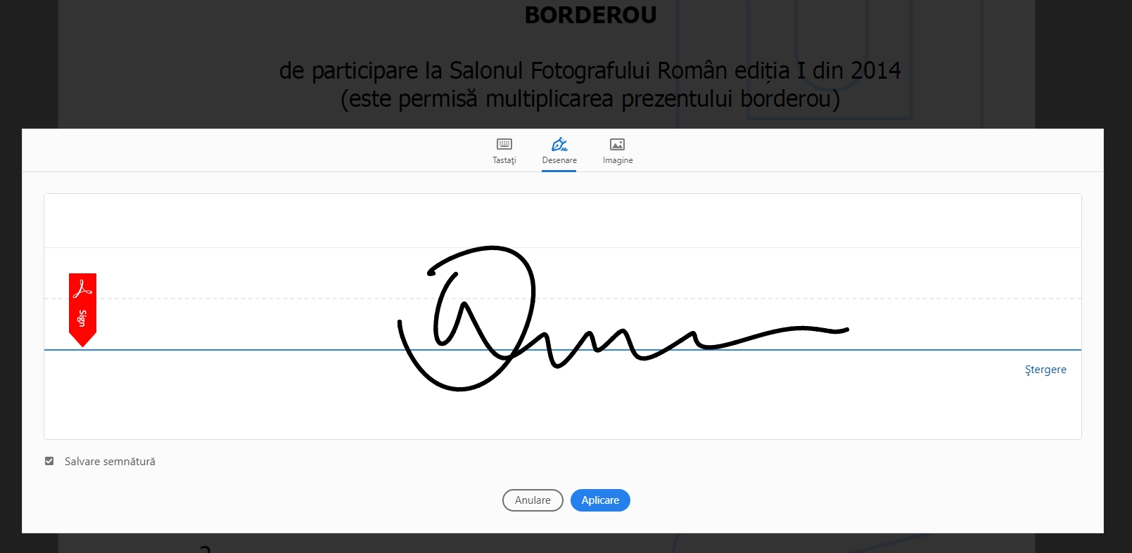 Putem alege să ”desenăm” semnătura cu mouse-ul sau cu o tabletă grafică sau să inserăm o imagine scanată/fotografiată a unei semnături pe care am făcut-o pe o hârtie, după ce am editat-o pentru ”curățare” fundal și contrast potrivit pentru o vizibilitate bună: