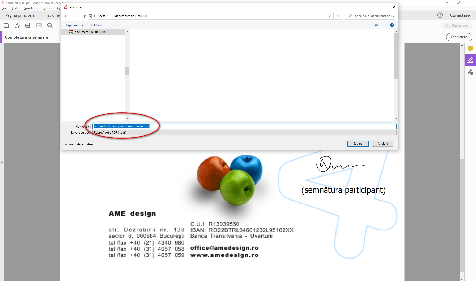 După ce am finalizat completarea documentului pdf cu texte, semnătură și eventuale ”bife” de pus, salvăm documentul, utilizând o sintaxă care va ușura clasificarea conținutului acestui document. Succes la completarea documentului/documentelor pdf!