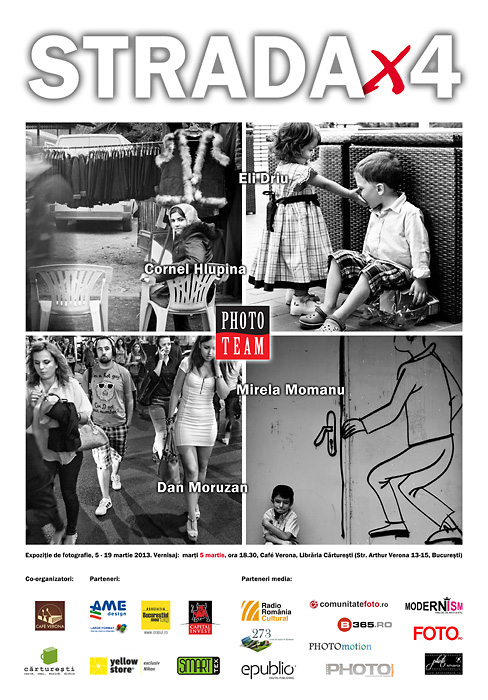 Vă invităm așadar la expoziția de fotografie „STRADA x4” ce va avea vernisajul marți 5 martie 2013, orele 18:30, la Café Verona din incinta Librăriei Cărturești – str. Arthur Verona nr. 13-15, sector 1, București.